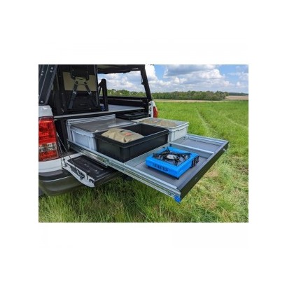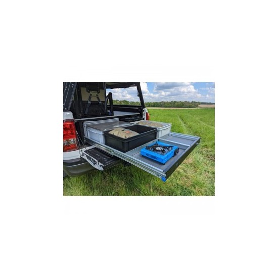 Ce tiroir de rangement Rockalu est conçu pour les pick-up double cabine, celui-ci offre une capacité de chargement de 120 kg, il permet d'accueillir jusqu'à 6 caisses au standard Européen 600 x 400 mm (vendues séparément).