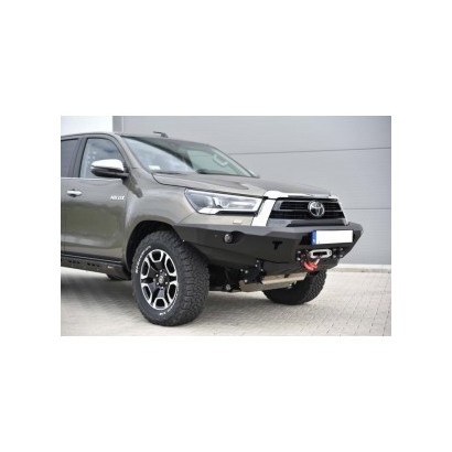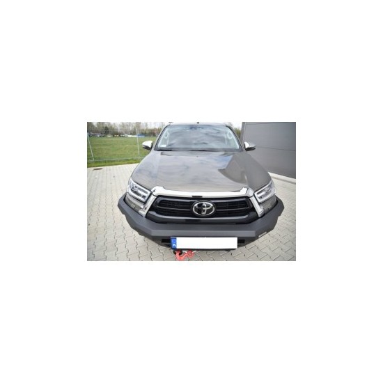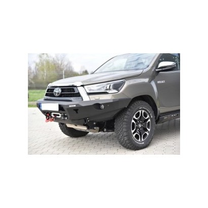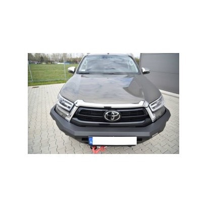 Pare-chocs avant, dédié au TOYOTA HILUX REVO 2020 A PRÉSENT. La structure du pare-chocs est en tôle de 4 mm d'épaisseur, et les fixations au châssis sont en tôle de 5 mm d'épaisseur. Le produit est d'abord découpé au laser, puis plié sur une presse plieuse CNC, et la forme correcte est obtenue lors de la finition manuelle.