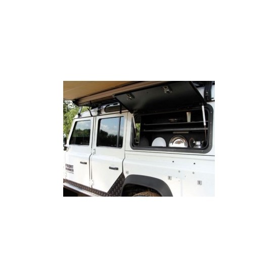 Le coffre pour le hayon latéral de Front Runner est utilisé en combinaison avec le hayon latéral en verre ou le hayon latéral en aluminium. Le coffre crée un espace supplémentaire pour votre Land Rover Defender TD5 . Les étagères pour le coffre peuvent être utilisées pour créer des compartiments afin de pouvoir ranger des objets.
